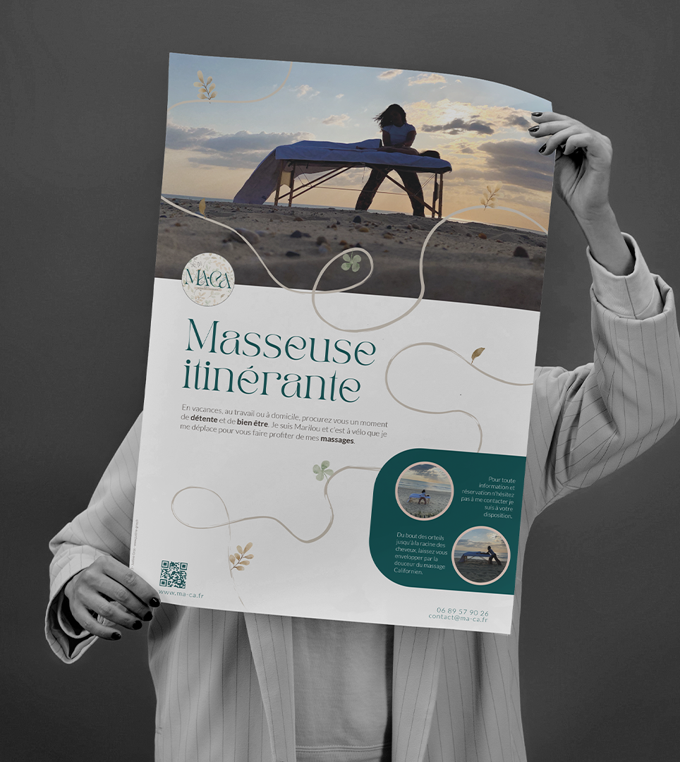 J’ai travaillé avec plaisir sur ce projet d’une amie qui a lancé son projet de masseuse itinérante. Elle avait besoin d’une affiche et d’une carte de visite pour communiquer et se faire connaître en passant de villes en villes avec son vélo.